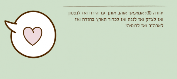 יהודה )6(: אמא,אני אוהב אותך עד הירח ואז לנפטון ואז לצדק ואז לנגה ואז לכדור הארץ בחזרה ואז לארה"ב ואז לרוסיה!