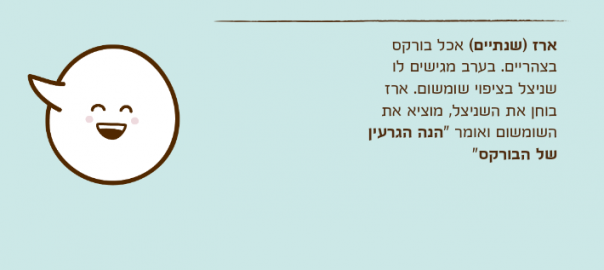 ארז )שנתיים( אכל בורקס בצהריים. בערב מגישים לו שניצל בציפוי שומשום. ארז בוחן את השניצל, מוציא את השומשום ואומר "הנה הגרעין של הבורקס"