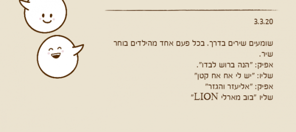 שומעים שירים בדרך. בכל פעם אחד מהילדים בוחר שיר.