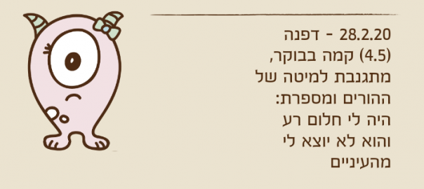 28.2.20 – דפנה )4.5( קמה בבוקר, מתגנבת למיטה של ההורים ומספרת: היה לי חלום רע והוא לא יוצא לי מהעיניים