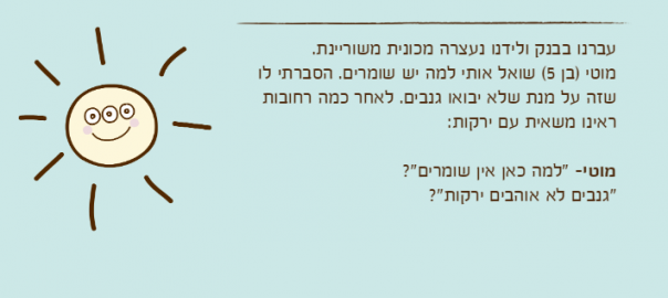 מוטי )בן 5( שואל אותי למה יש שומרים. הסברתי לו שזה על מנת שלא יבואו גנבים. לאחר כמה רחובות ראינו משאית עם ירקות: