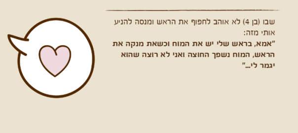 שבו )בן 4( לא אוהב לחפוף את הראש ומנסה להניע אותי מזה: