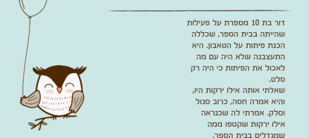 דור בת 10 מספרת על פעילות שהייתה בבית הספר, שכללה הכנת פיתות על הטאבון. היא התעצבנה שלא היה עם מה לאכול את הפיתות כי היה רק סלט.