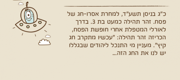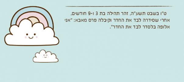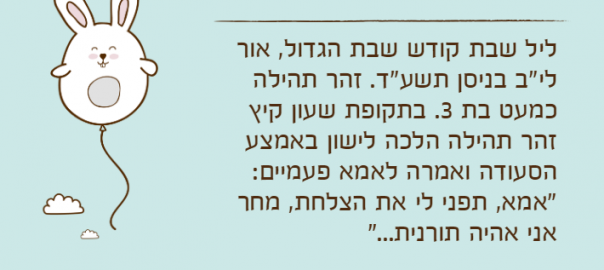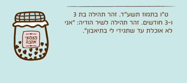 ליל שבת קודש שבת הגדול, אור לי"ב בניסן תשע"ד. זהר תהילה כמעט בת 3. בתקופת שעון קיץ זהר תהילה הלכה לישון באמצע הסעודה ואמרה לאמא פעמיים: "אמא, תפני לי את הצלחת, מחר אני אהיה תורנית…"