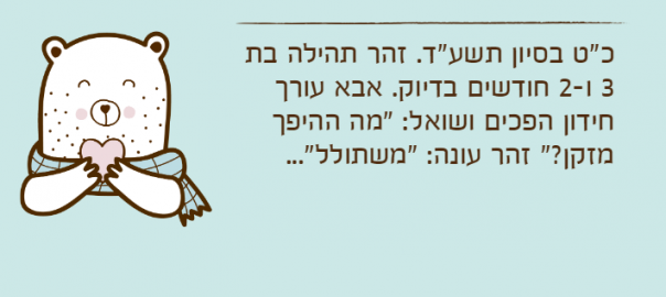 כ"ט בסיון תשע"ד. זהר תהילה בת 3 ו-2 חודשים בדיוק. אבא עורך חידון הפכים ושואל: "מה ההיפך מזקן?" זהר עונה: "משתולל"…