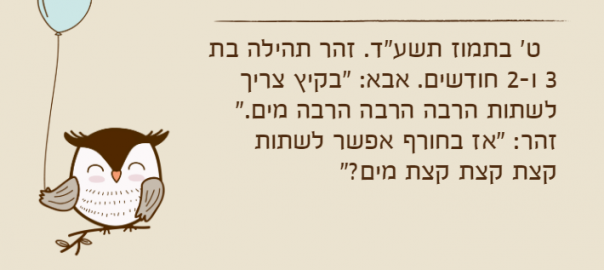 ט' בתמוז תשע"ד. זהר תהילה בת 3 ו-2 חודשים. אבא: "בקיץ צריך לשתות הרבה הרבה הרבה מים." זהר: "אז בחורף אפשר לשתות קצת קצת קצת מים?"