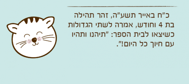 כ"ח באייר תשע"ה, זהר תהילה בת 4 וחודש, אמרה לשתי הגדולות כשיצאו לבית הספר: "תיהנו ותהיו עם חיוך כל היום!".