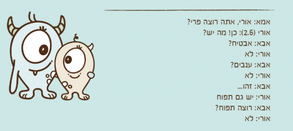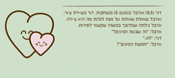 דור )9.5( וארבל )כמעט 6( משחקות. דור מציירת ציור, וארבל שואלת שאלות על מנת לגלות מה היא ציירה. ארבל גילתה שמדובר במשהו שקשור לפירות.