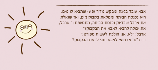 אבא עובד בגינה ומבקש מדור )9.5( שתביא לו מים. היא נכנסת הביתה וממלאת בקבוק מים, ואז שואלת את ארבל שבדיוק נכנסת הביתה, מתנשפת: " ארבל, את יכולה להביא לאבא את הבקבוק?"