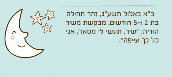 כ"א באלול תשע"ג, זהר תהילה בת 2 ו-5 חודשים. מבקשת משיר הודיה: "שיר, תעשי לי מסאז', אני כל כך עייפה".