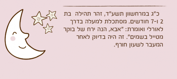 כ"ג במרחשוון תשע"ד, זהר תהילה בת 2 ו-7 חודשים. מסתכלת למעלה בדרך לאורלי ואומרת: "אבא, הנה ירח של בוקר מטייל בשמים". זה היה בדיוק לאחר המעבר לשעון חורף.