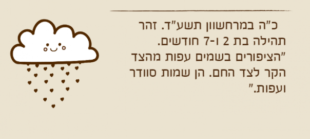 כ"ה במרחשוון תשע"ד. זהר תהילה בת 2 ו-7 חודשים. "הציפורים בשמים עפות מהצד הקר לצד החם. הן שמות סוודר ועפות."