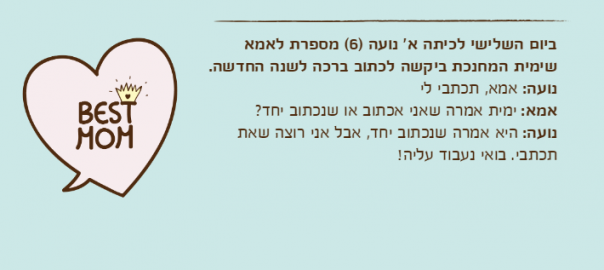 ביום השלישי לכיתה א' נועה )6( מספרת לאמא שימית המחנכת ביקשה לכתוב ברכה לשנה החדשה.
