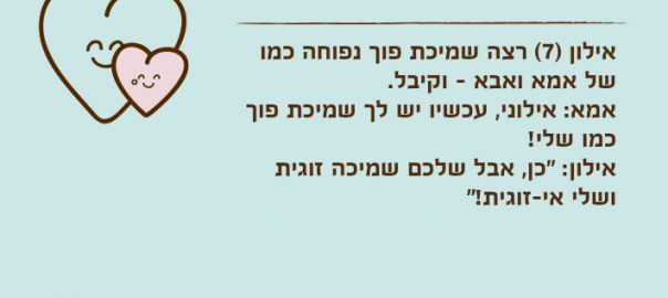אילון (7) רצה שמיכת פוך נפוחה אילון )7( רצה שמיכת פוך נפוחה כמו של אמא ואבא – וקיבל. אמא: אילוני, עכשיו יש לך שמיכת פוך כמו שלי! אילון: "כן, אבל שלכם שמיכה זוגית ושלי אי-זוגית!"