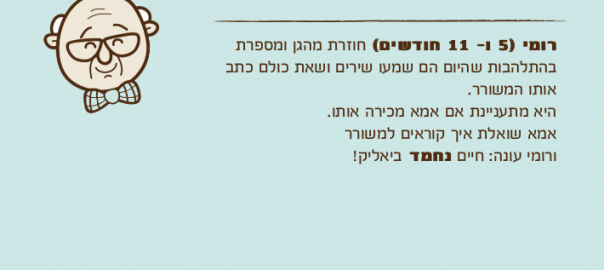 רומי )5 ו- 11 חודשים( חוזרת מהגן ומספרת בהתלהבות שהיום הם שמעו שירים ושאת כולם כתב אותו המשורר.