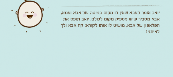 יואב אומר לאבא שאין לו מקום במיטה של אבא ואמא, אבא מסביר שיש מספיק מקום לכולם. יואב תופס את הפלאפון של אבא, מושיט לו אותו לקורא: קח אבא ולך לאיתני!