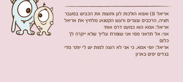 אריאל )3( ואמא הולכות לגן וחוצות את הכביש במעבר חציה, הרכבים עוצרים ורעש הקטנוע מלחיץ את אריאל