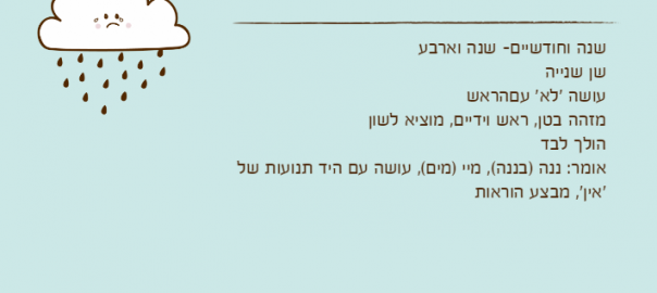 אומר: ננה )בננה(, מיי )מים(, עושה עם היד תנועות של 'אין', מבצע הוראות