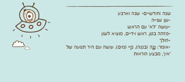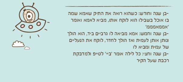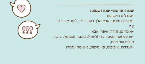 -בן שנה וחודש: כשהוא רואה את התיק שאמא שמה בו אוכל בשבילו הוא לוקח אותו, מביא לאמא ואומר 'אממאמממ'