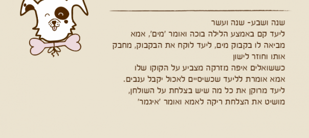 ליעד קם באמצע הלילה בוכה ואומר 'מים', אמא מביאה לו בקבוק מים, ליעד לוקח את הבקבוק, מחבק אותו וחוזר לישון