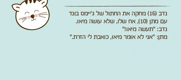 נדב )16( מחקה את החתול של ג'יימס בונד עם מתן )10(, אח שלו, שלא עושה מיאו.