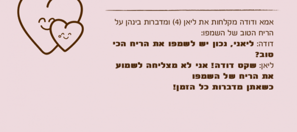 אמא ודודה מקלחות את ליאן )4( ומדברות בינהן על הריח הטוב של השמפו: