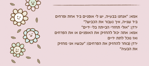 אמא: אתה יכול להחזיק את האופניים או את הפרחים ואז נוכל לתת ידיים