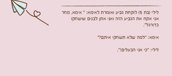 לילי )בת 5( לוקחת גביע ואומרת לאימא: " אימא, מחר אני אקח את הגביע הזה ואני אתן לבנים שישחקו כדורגל".