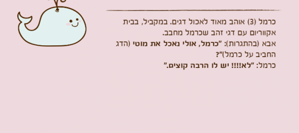 אבא )בהתגרות(: "כרמל, אולי נאכל את מוטי )הדג החביב על כרמל(?"