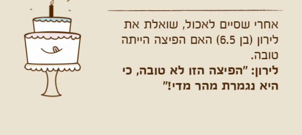 אחרי שסיים לאכול, שואלת את לירון )בן 6.5( האם הפיצה הייתה טובה.