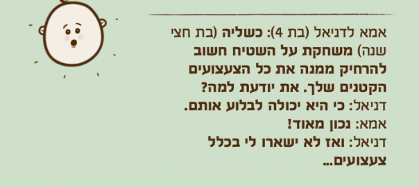 אמא לדניאל )בת 4(: כשליה )בת חצי שנה( משחקת על השטיח חשוב להרחיק ממנה את כל הצעצועים הקטנים שלך. את יודעת למה?