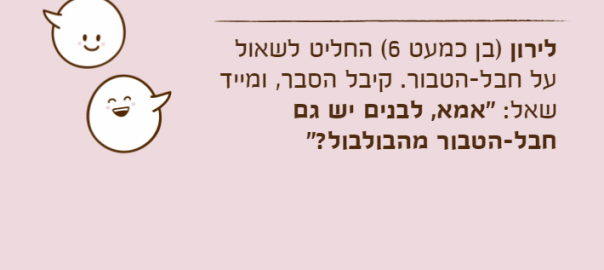 לירון )בן כמעט 6( החליט לשאול על חבל-הטבור. קיבל הסבר, ומייד שאל: "אמא, לבנים יש גם חבל-הטבור מהבולבול?"