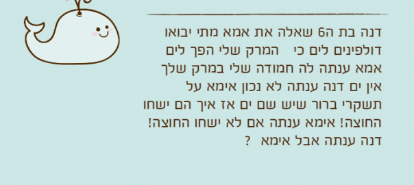 דנה בת ה6 שאלה את אמא מתי יבואו דולפינים לים כי המרק שלי הפך לים אמא ענתה לה חמודה שלי במרק שלך אין ים דנה ענתה לא נכון אימא על תשקרי ברור שיש שם ים אז איך הם ישחו החוצה! אימא ענתה אם לא ישחו החוצה! דנה ענתה אבל אימא ?