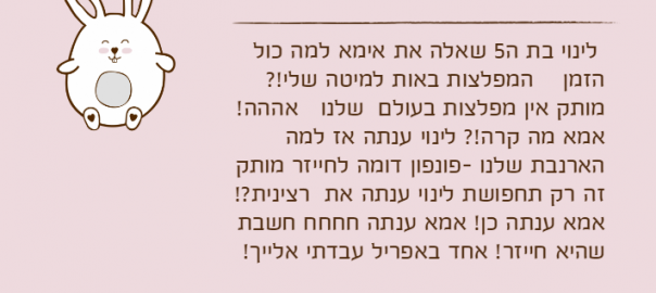 לינוי בת ה5 שאלה את אימא למה כול הזמן המפלצות באות למיטה שלי!? מותק אין מפלצות בעולם שלנו אההה! אמא מה קרה!? לינוי ענתה אז למה הארנבת שלנו -פונפון דומה לחייזר מותק זה רק תחפושת לינוי ענתה את רצינית?! אמא ענתה כן! אמא ענתה חחחח חשבת שהיא חייזר! אחד באפריל עבדתי אלייך!