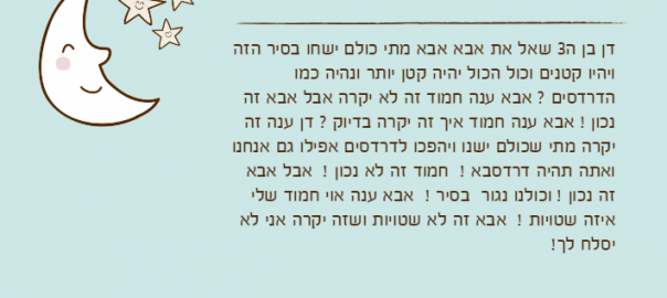 דן בן ה3 שאל את אבא אבא מתי כולם ישחו בסיר הזה ויהיו קטנים וכול הכול יהיה קטן יותר ונהיה כמו הדרדסים ? אבא ענה חמוד זה לא יקרה אבל אבא זה נכון ! אבא ענה חמוד איך זה יקרה בדיוק ? דן ענה זה יקרה מתי שכולם ישנו ויהפכו לדרדסים אפילו גם אנחנו ואתה תהיה דרדסבא ! חמוד זה לא נכון ! אבל אבא זה נכון ! וכולנו נגור בסיר ! אבא ענה אוי חמוד שלי איזה שטויות ! אבא זה לא שטויות ושזה יקרה אני לא יסלח לך!