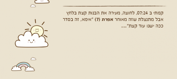 קמתי ב 07:24, לחוצה, מעירה את הבנות קצת בלחץ אבל מתנצלת שזה מאוחר אפרת )7( "אימא, זה בסדר ככה ישנו עוד קצת"…..