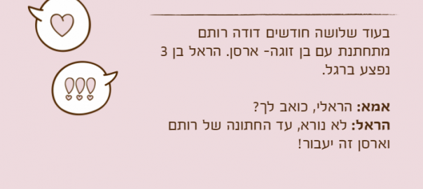 בעוד שלושה חודשים דודה רותם מתחתנת עם בן זוגה- ארסן. הראל בן 3 נפצע ברגל.