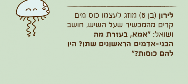 לירון )בן 6( מוזג לעצמו כוס מים קרים מהמכשיר שעל השיש, חושב ושואל: "אמא, בעזרת מה הבני-אדמים הראשונים שתו? היו להם כוסות?"