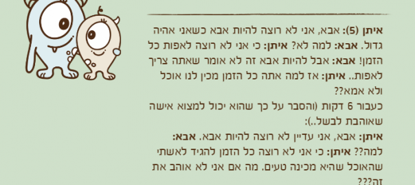 איתן )5(: אבא, אני לא רוצה להיות אבא כשאני אהיה גדול. אבא: למה לא? איתן: כי אני לא רוצה לאפות כל הזמן! אבא: אבל להיות אבא זה לא אומר שאתה צריך לאפות.. איתן: אז למה אתה כל הזמן מכין לנו אוכל ולא אמא??