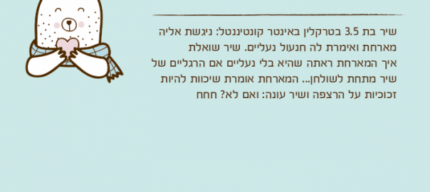 שיר בת 3.5 בטרקלין באינטר קונטיננטל: ניגשת אליה מארחת ואימרת לה חנעול נעליים. שיר שואלת