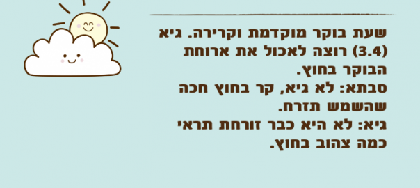 שעת בוקר מוקדמת וקרירה. גיא )3.4( רוצה לאכול את ארוחת הבוקר בחוץ.