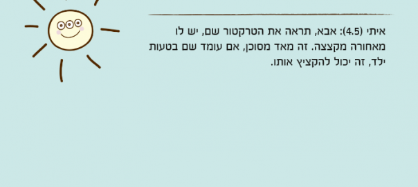 איתי )4.5(: אבא, תראה את הטרקטור שם, יש לו מאחורה מקצצה. זה מאד מסוכן, אם עומד שם בטעות ילד, זה יכול להקציץ אותו.