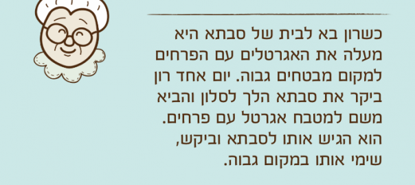 כשרון בא לבית של סבתא היא מעלה את האגרטלים עם הפרחים למקום מבטחים גבוה. יום אחד רון ביקר את סבתא הלך לסלון והביא משם למטבח אגרטל עם פרחים. הוא הגיש אותו לסבתא וביקש, שימי אותו במקום גבוה.