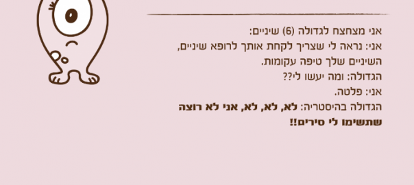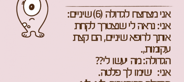 אני: נראה לי שצריך לקחת אותך לרופא שיניים, השיניים שלך טיפה עקומות.