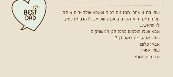 שלו בת 4 אחרי תחנונים רבים שאבא שלה ירים אותה על הידיים והוא מסרב בטענה שכואב לו הגב או כואב לו הראש…