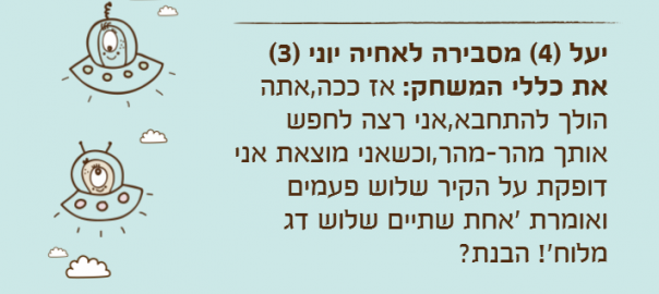 יעל )4( מסבירה לאחיה יוני )3( את כללי המשחק: אז ככה,אתה הולך להתחבא,אני רצה לחפש אותך מהר-מהר,וכשאני מוצאת אני דופקת על הקיר שלוש פעמים ואומרת 'אחת שתיים שלוש דג מלוח'! הבנת?