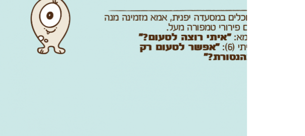 אוכלים במסעדה יפנית, אמא מזמינה מנה עם פירורי טמפורה מעל.