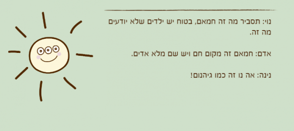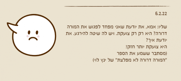 שליו: אמא, את יודעת שאני מפחד לפגוש את המורה דרורה? היא רק רק צועקת. ויש לה שיטה להירגע. את יודעת איך?