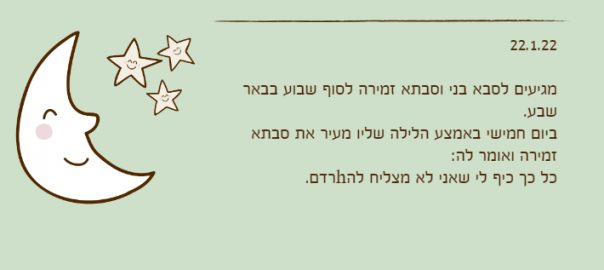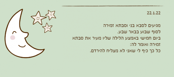 ביום חמישי באמצע הלילה שליו מעיר את סבתא זמירה ואומר לה: