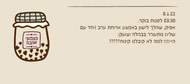 אפיק, שהלך לישון באמצע ארוחת ערב )יחד עם שליו( מתעורר בבהלה וצועק: